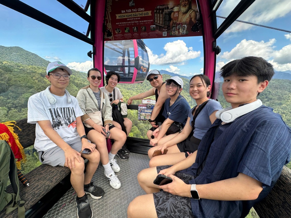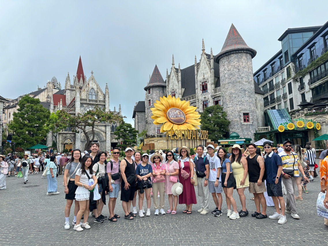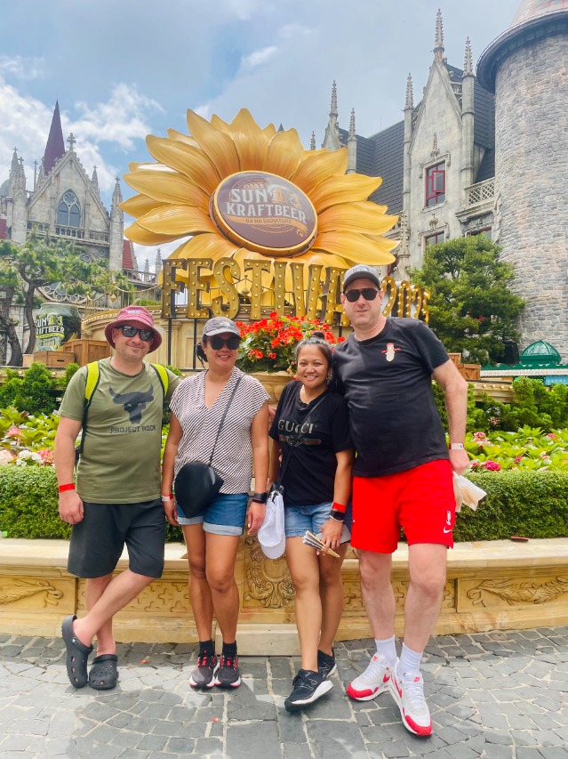 9:30 AM: At Ba Na Hills, you take pictures at the iconic Ba Na fountain while waiting for the guide gets the tickets. You go on the cabin from Suoi Mo station - the longest cable bin and the highest difference between the station and the terminal.